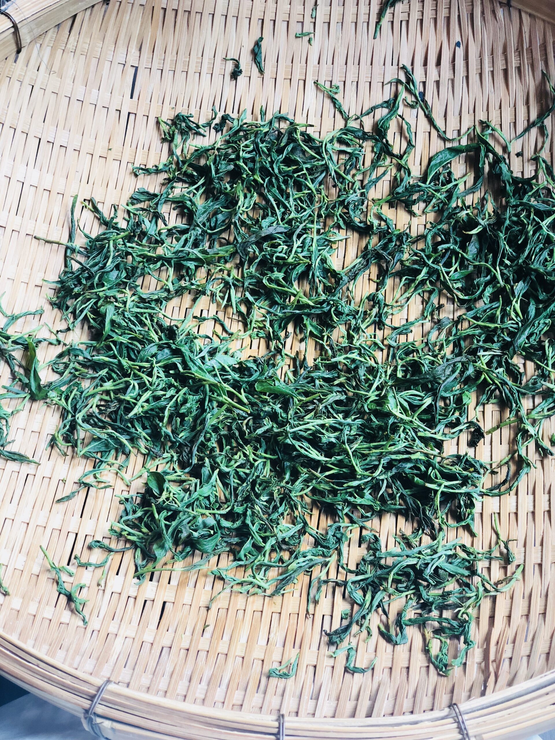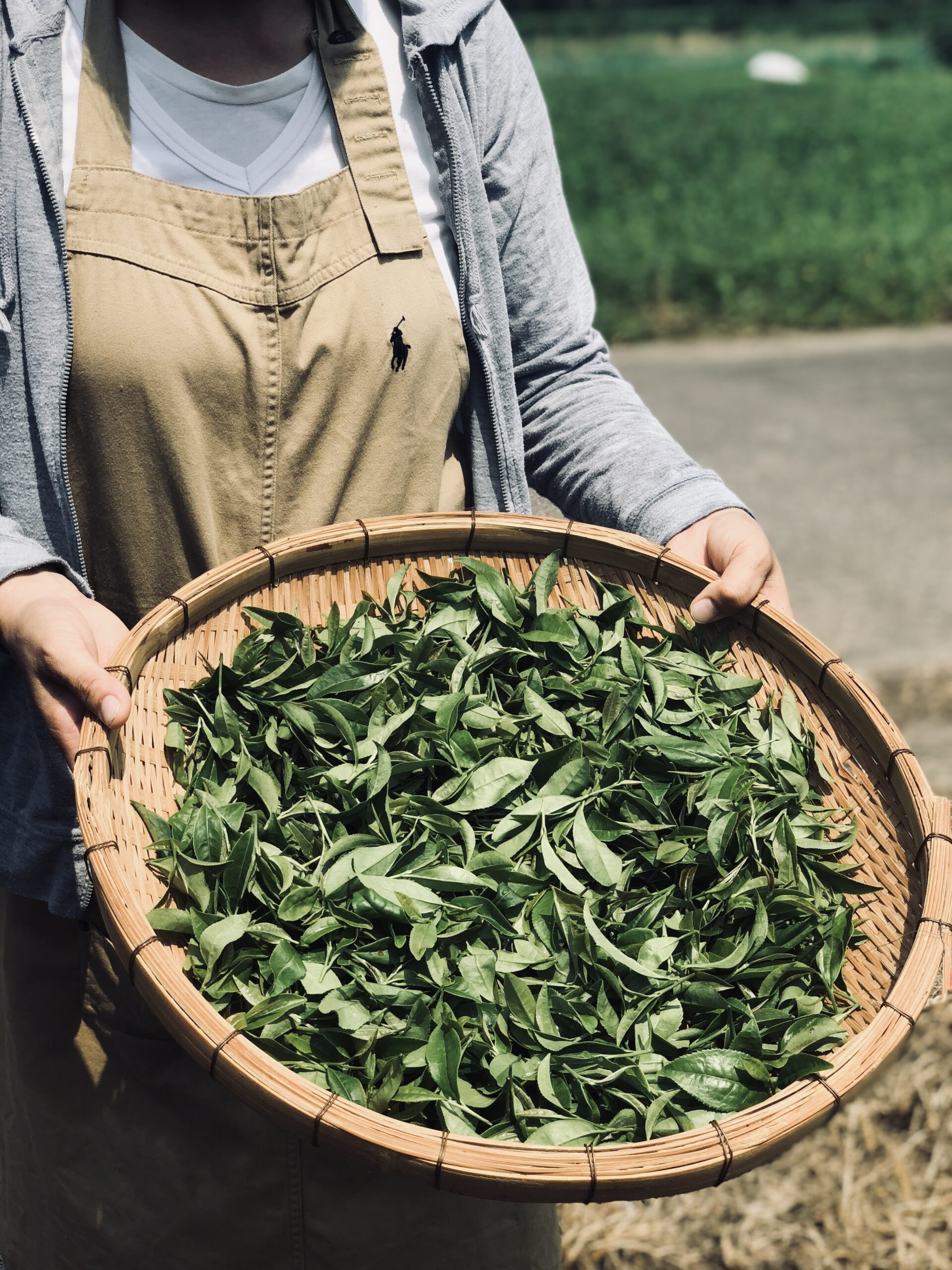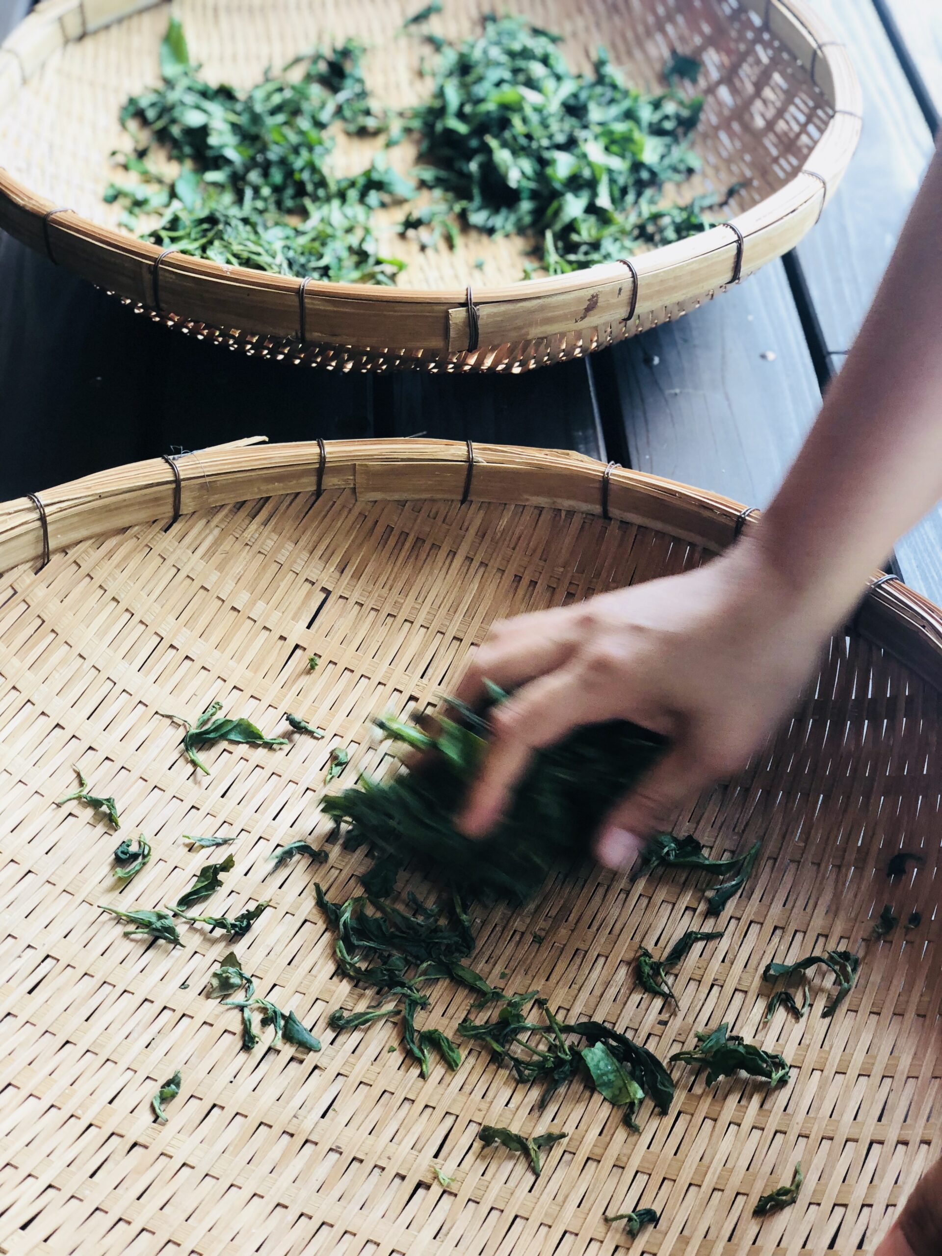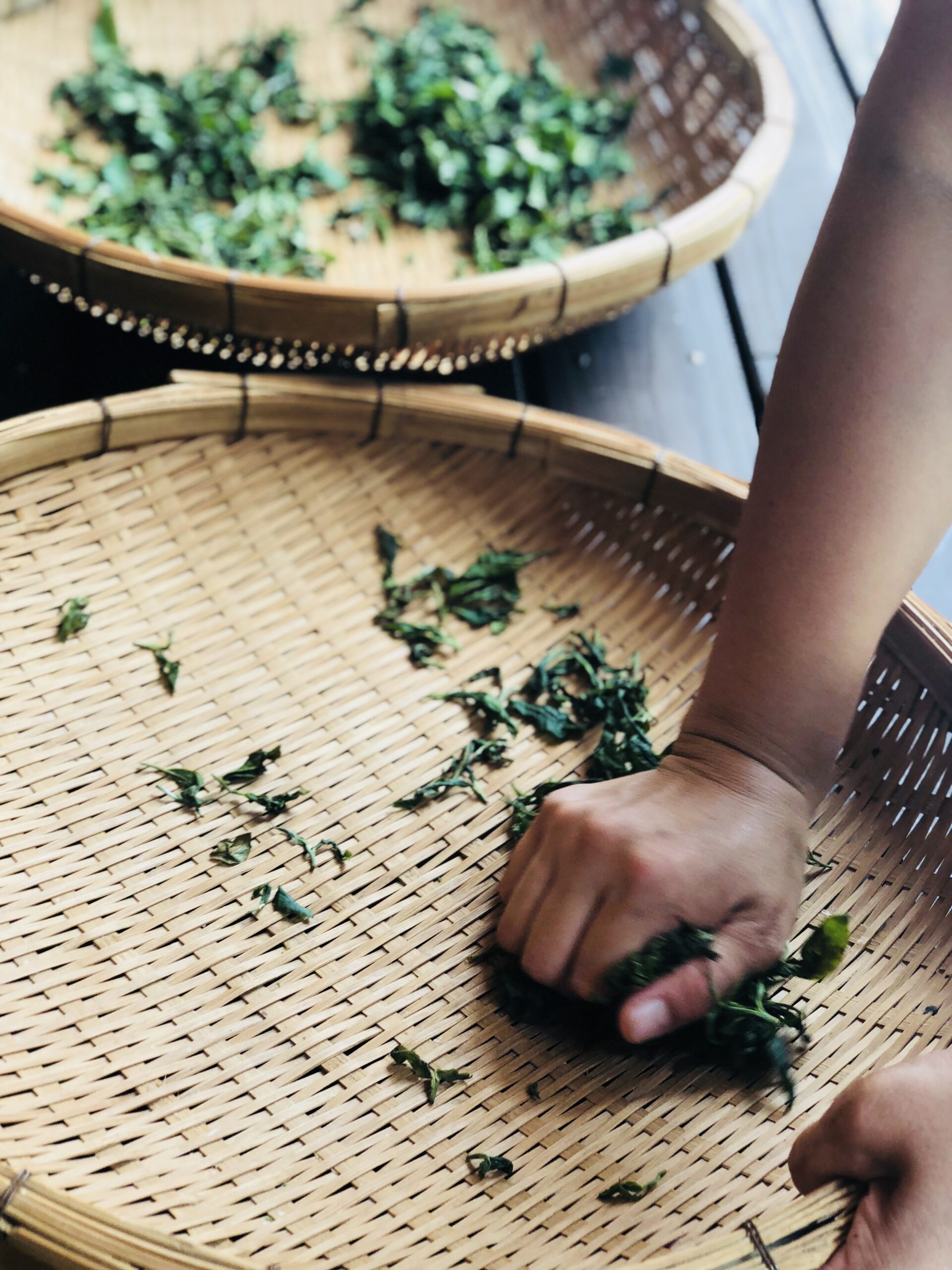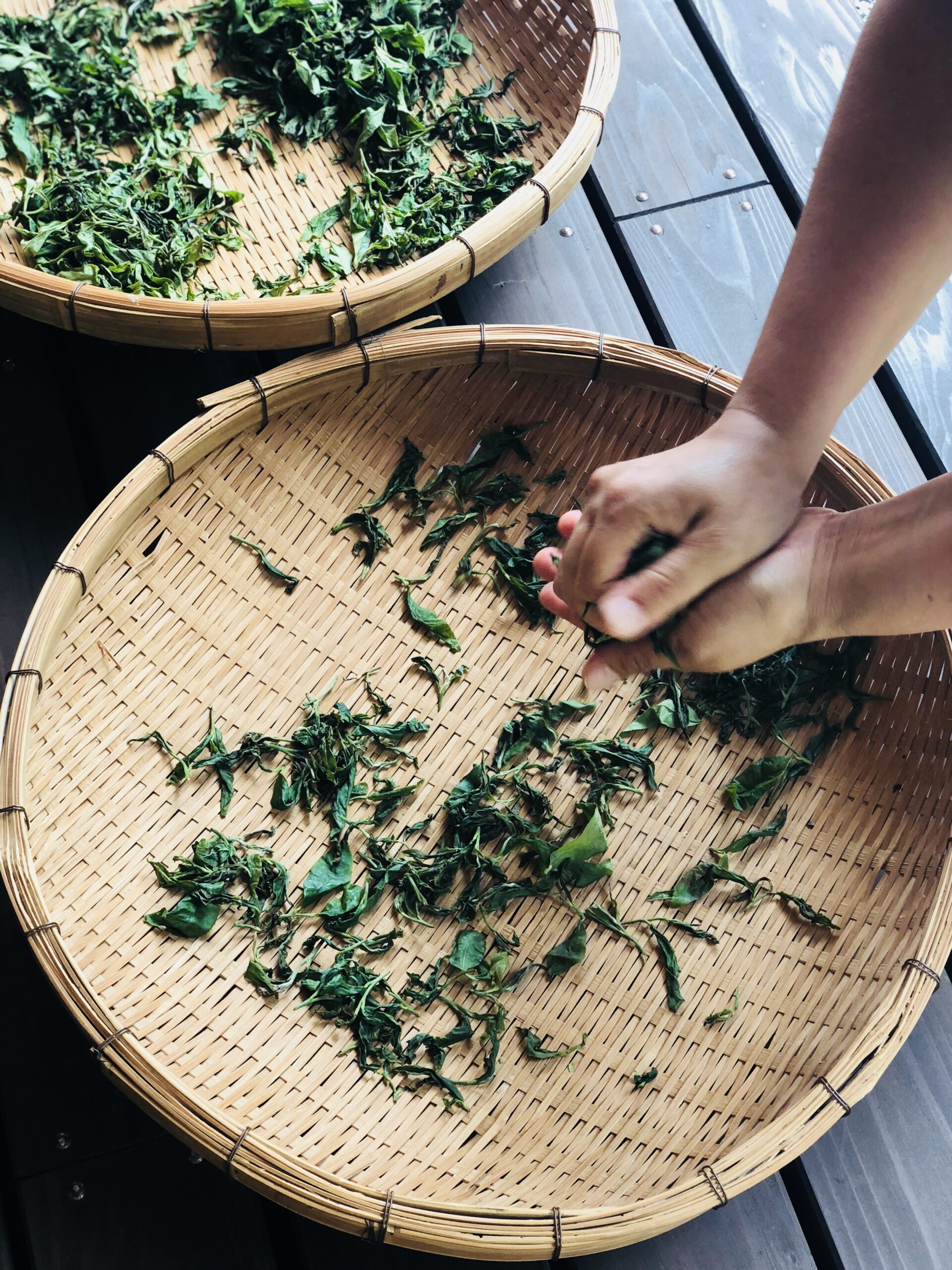 さきほど摘んだ茶葉。1時間ほど天日に干してから、手でもんでいきます。
