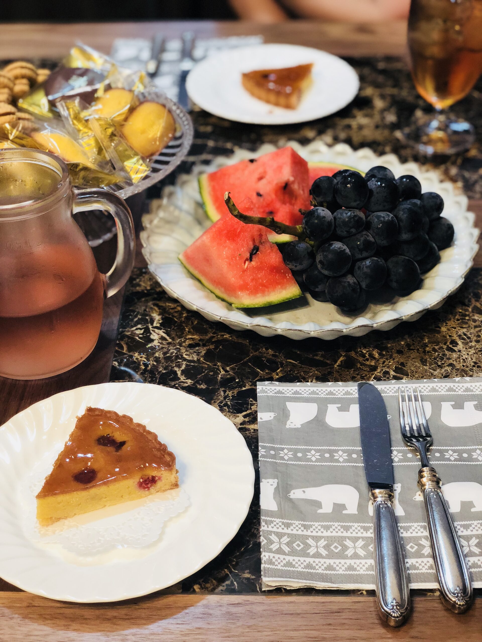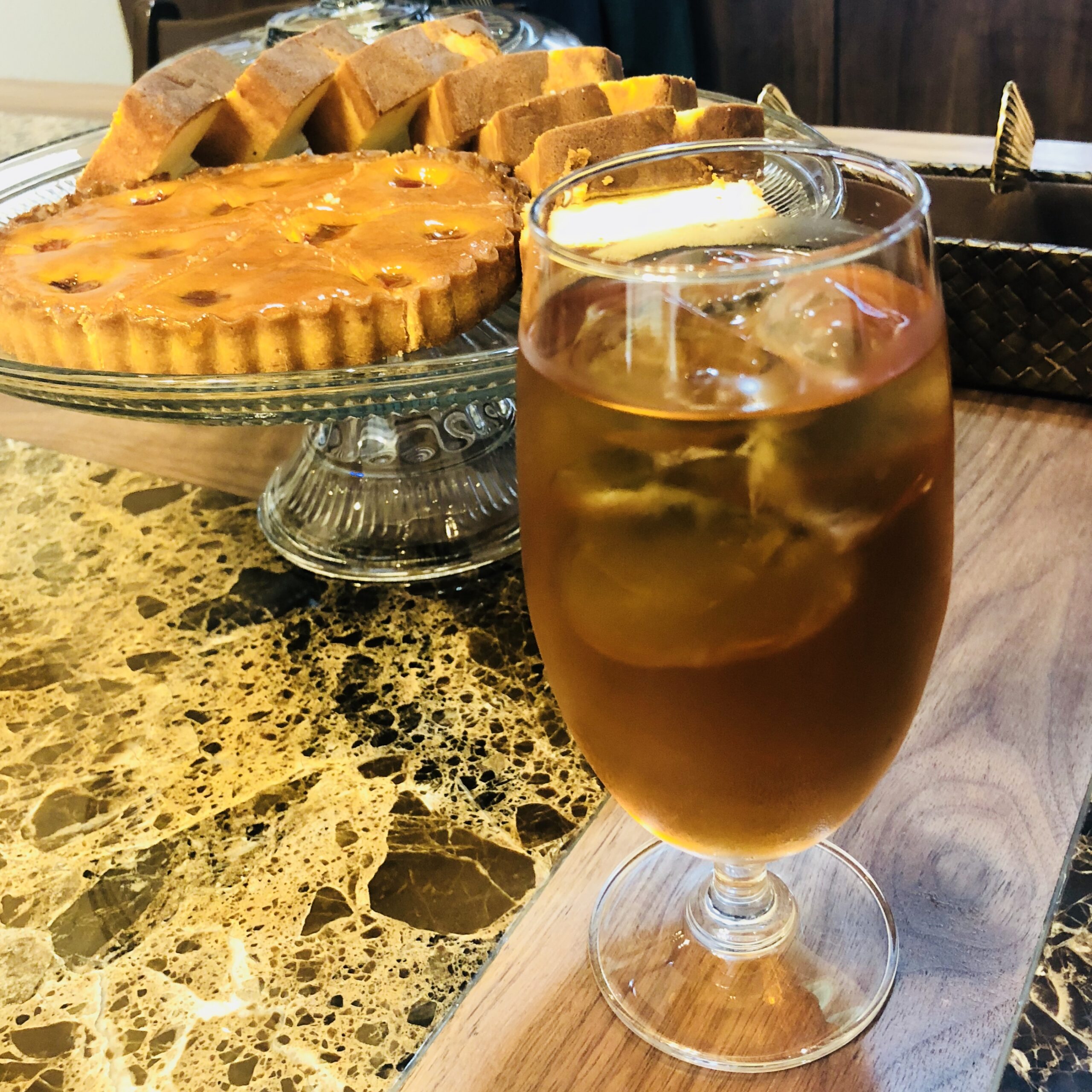 東郷産のぶどうやル・プレジール特製ラズベリー・タルトなど、アイスティと相性抜群♪カットしたフルーツをアイスティに入れて、フルーツティにしても美味。
