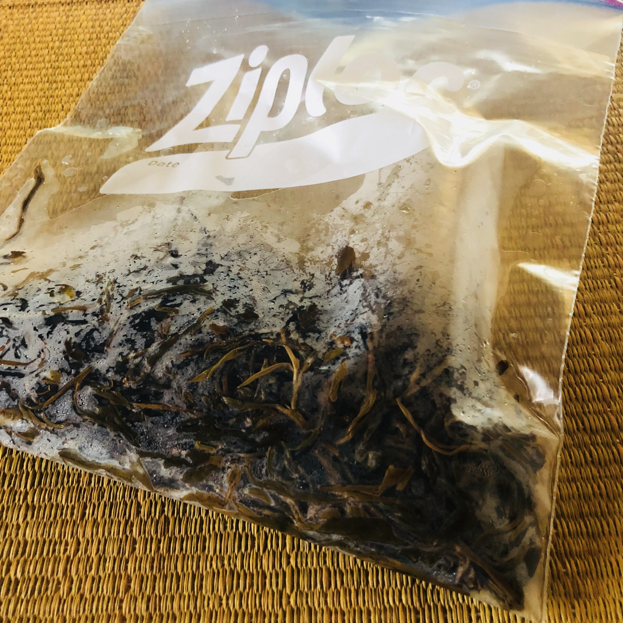 今回は紅茶にするため手もみした茶葉をジップロックに入れ、お天気が良かったので、車のダッシュボードに放置することで、熱を加えてみました。