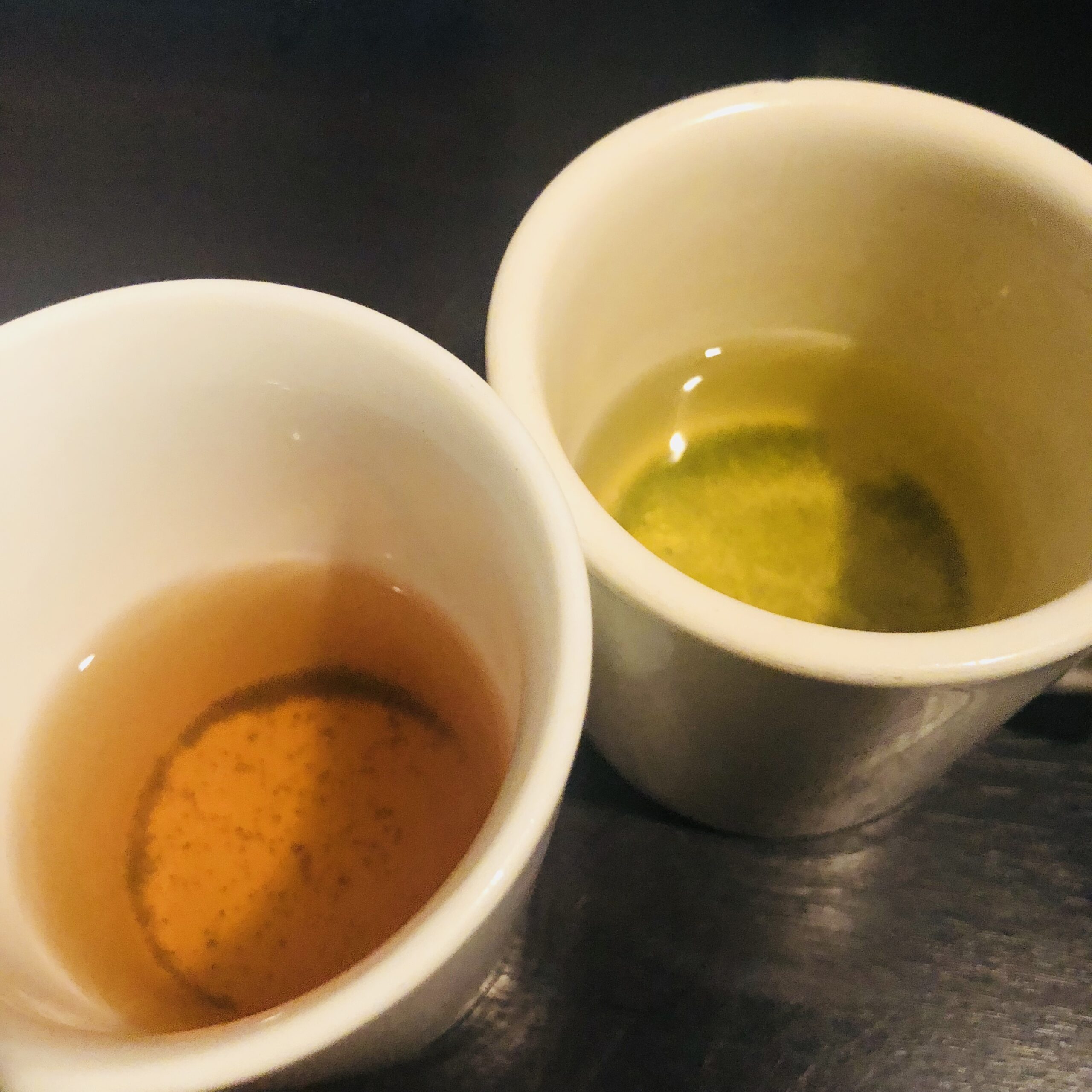 比較用に並べた緑茶(右)と紅茶(左)。淡い水色(すいしょく)の品の良い紅茶ができました~♪