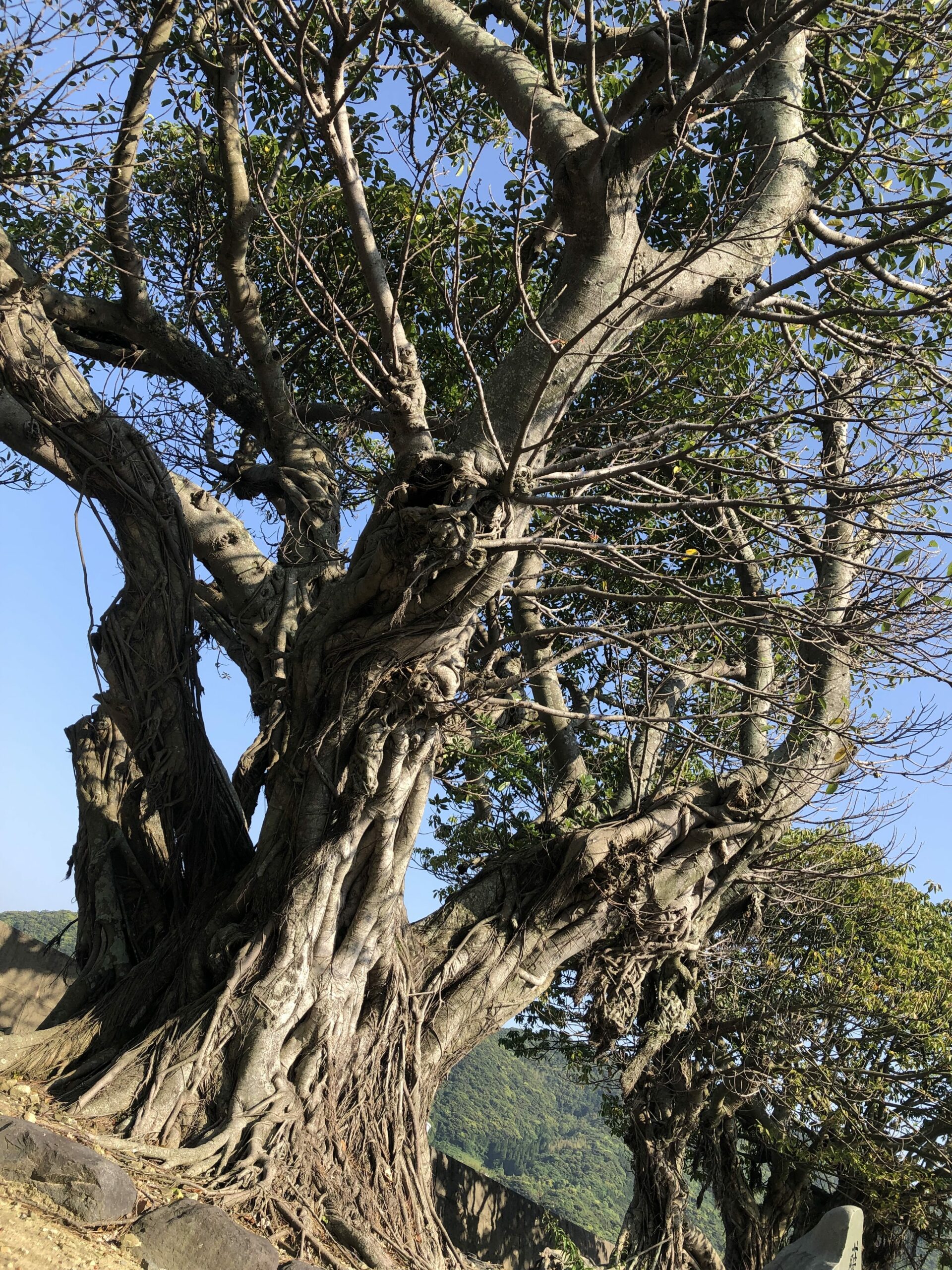 海を見ながら黄昏ていると、おっと、こんな時間!里港に向かいます。里中学校の前にあるT字路には『アコウの樹』が島を見守ってくれていました。