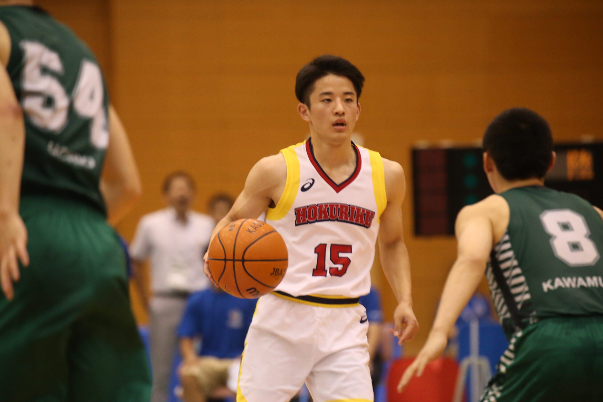 河村選手とマッチアップした北陸の2年生ガード土家拓大選手。
