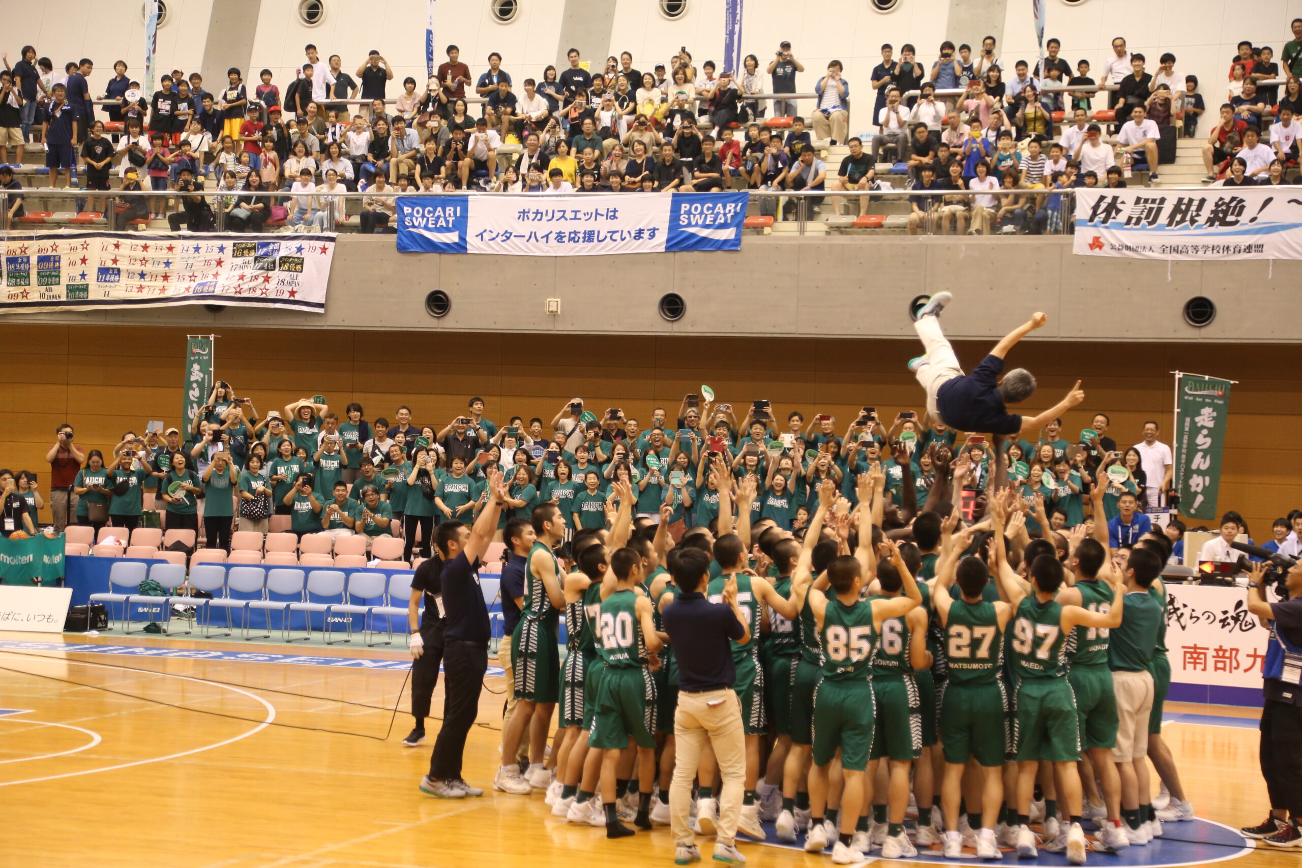 優勝が決まったあと、部員77名と監督・スタッフが輪になり校歌を斉唱。井手口監督の胴上げに歓喜の声が沸いた。