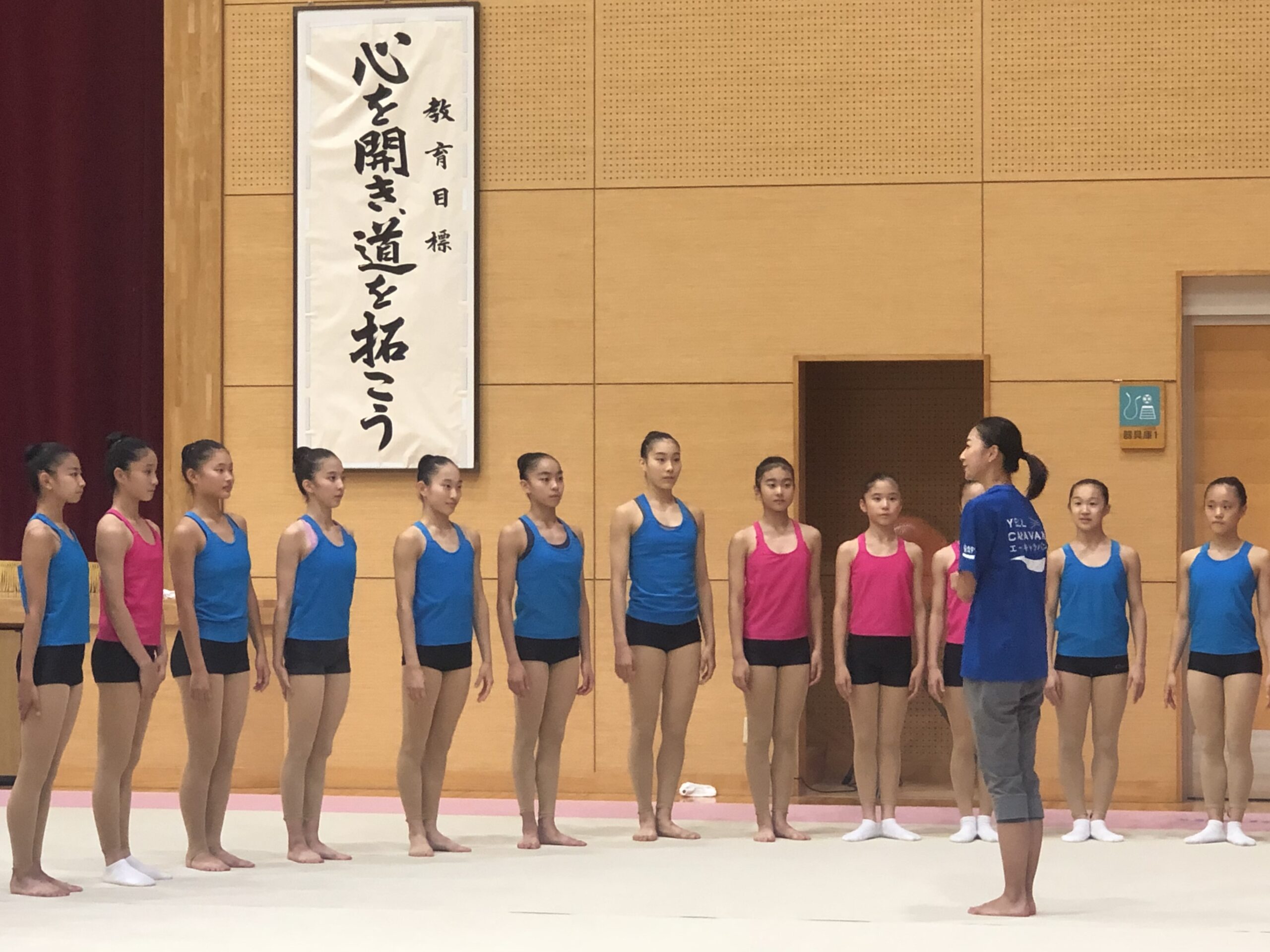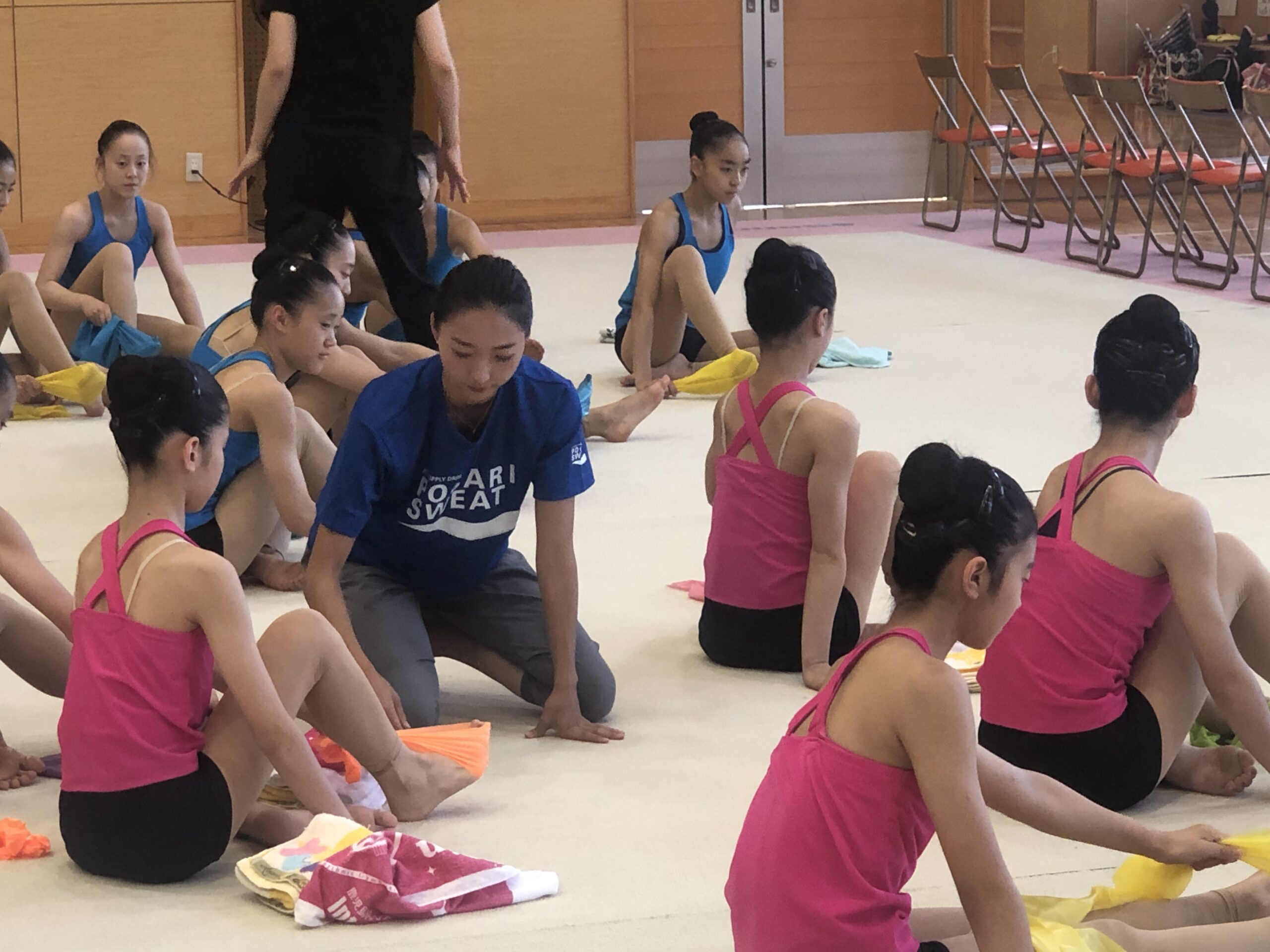 講演後、新体操部の指導がスタート。タオルを足裏でたぐり寄せるトレーニングから始まり、柔軟体操、ストレッチと丁寧に指導していきます。