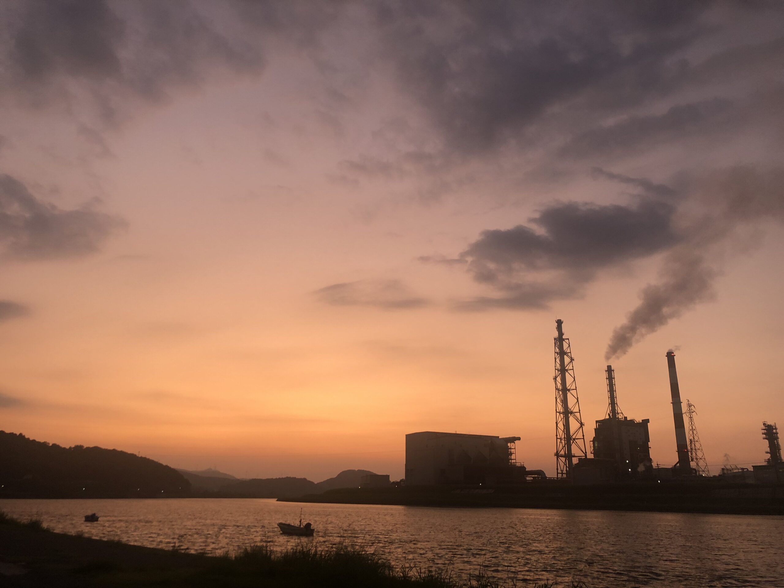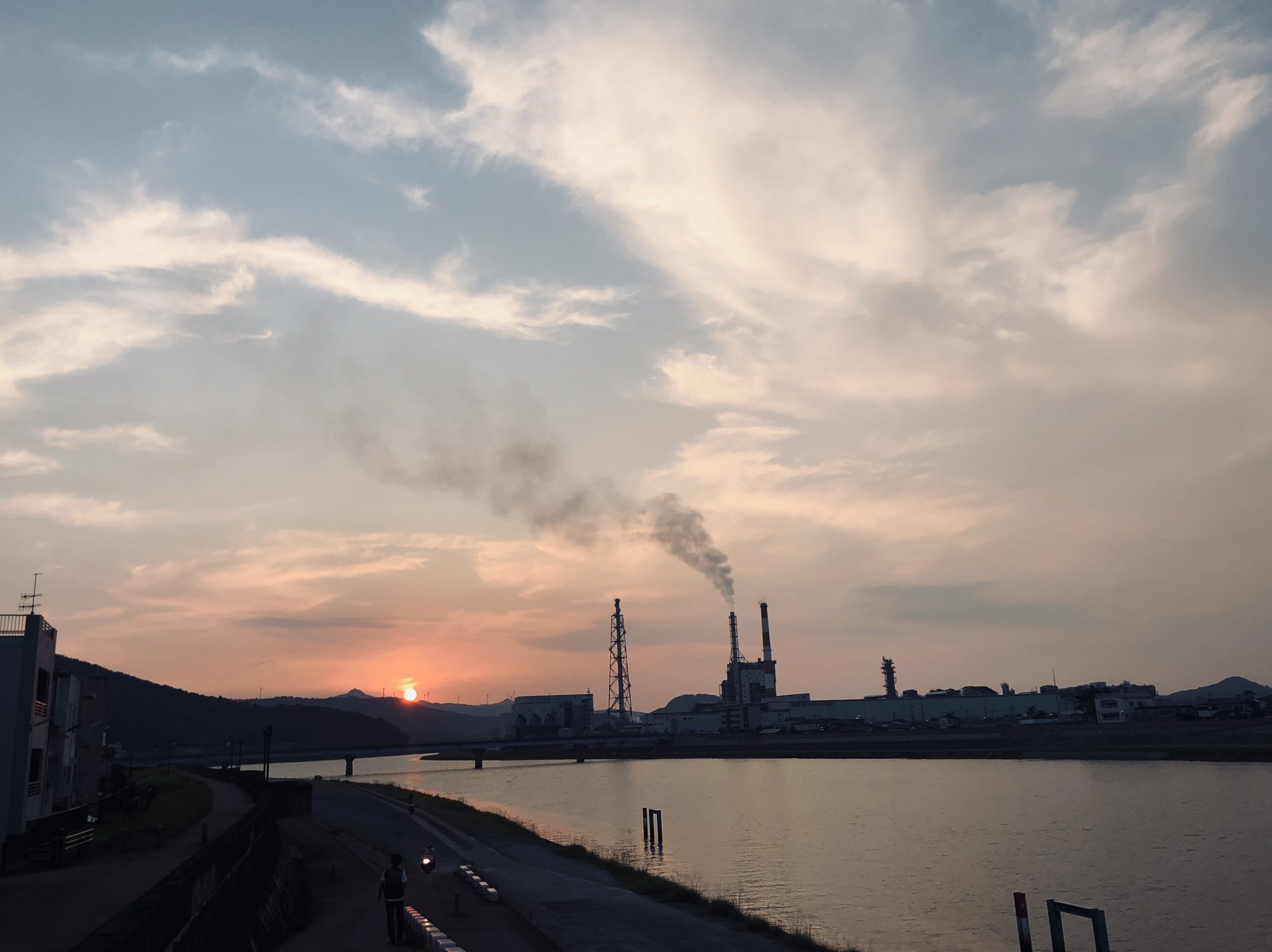 川内川の向こうに沈む夕日を見送る